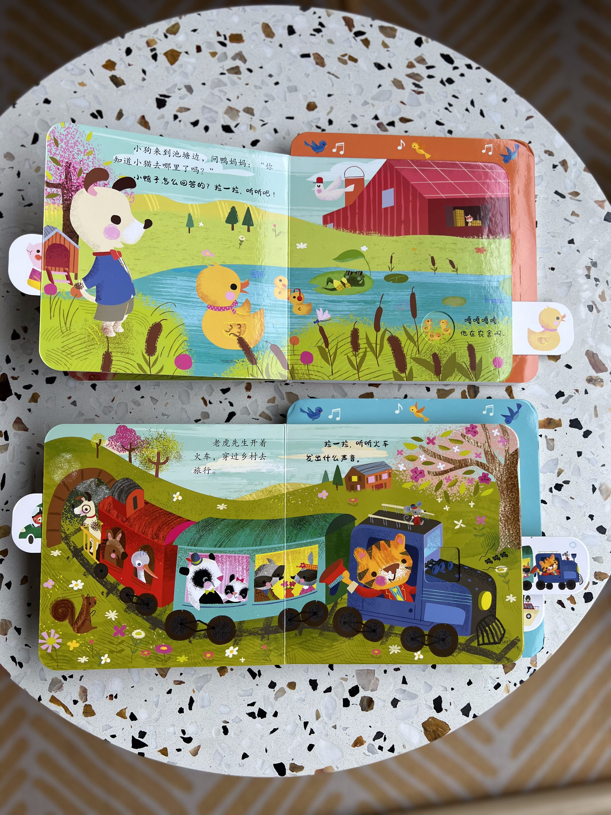 Featuring four fun settings - forest, city, farm and birthday party - your little ones will enjoy pulling on the tabs to hear the sounds made! The Chinese stories are also simple yet engaging, with prompts to promote curiosity and learning. This set of 4 books is perfect for auditory learners and kids who love music and animals!