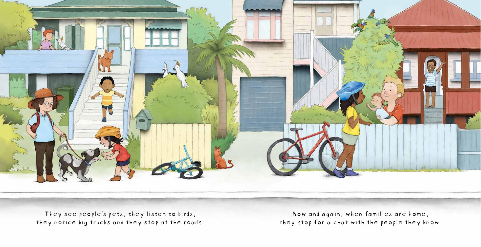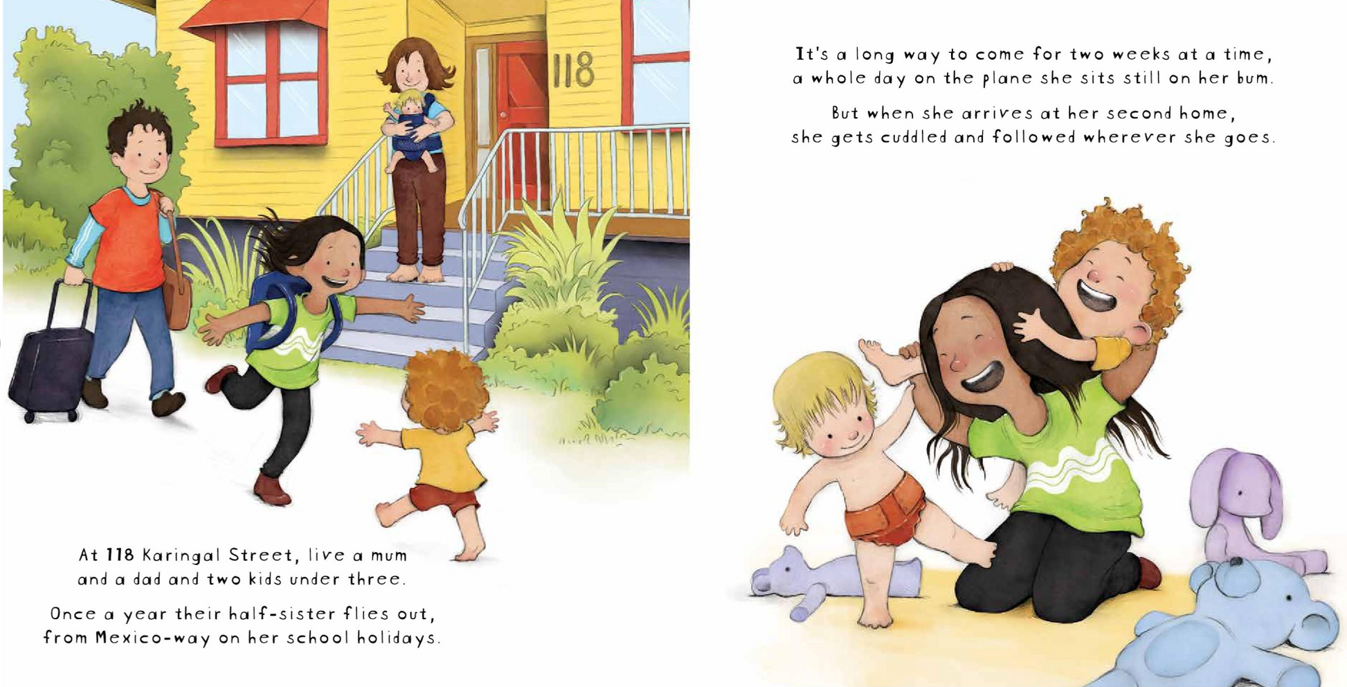 This bright and colourful picture book gives a snapshot of all kinds of family units. A young girl and her mum ride their bikes around the neighbourhood chatting with the families they know on their journey. There are families with two dads or two mums, a foster family, single parent families with either a dad or a mum, a family with a half sister who flies in from Mexico in her school holidays, a family where Grandma helps out as the mother has passed away, a stay-at-home dad family plus a huge extended family.