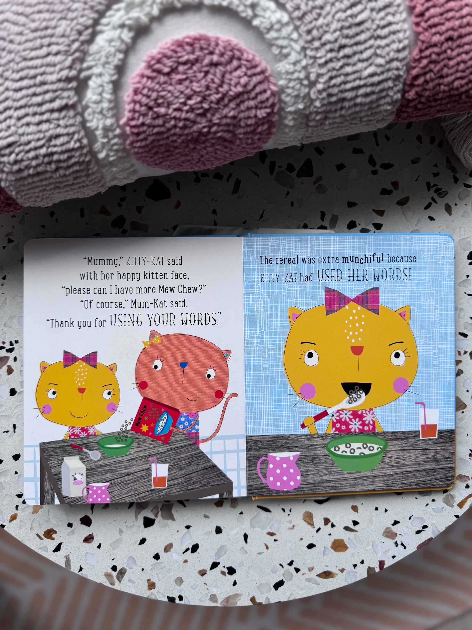 Join Kitty-Kat on an engaging journey filled with lively vocabulary and delightful rhymes. Each page is a treasure trove of new words, encouraging kids to communicate clearly and confidently. The book also features a tactile vinyl character on the cover, making it a visually and physically appealing experience for young hands.