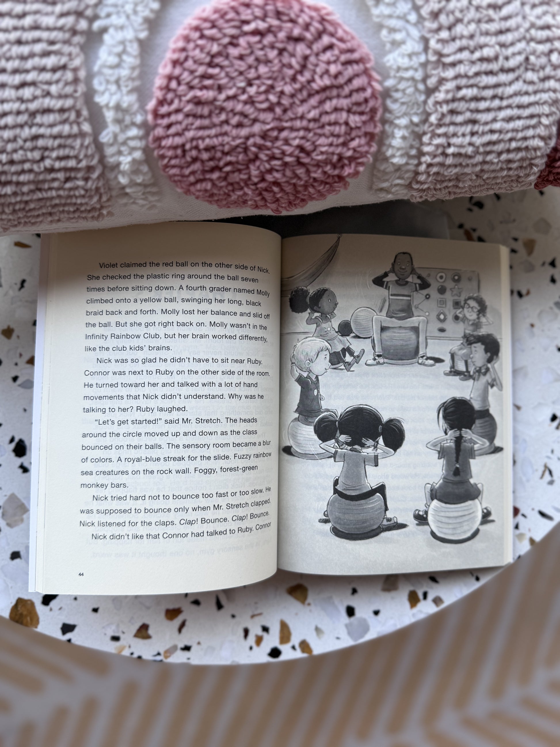 The Infinity Rainbow Club is a chapter book series featuring five neurodivergent children in a club at their elementary school. The club provides a safe space for stims and different communication styles to be accepted and celebrated.