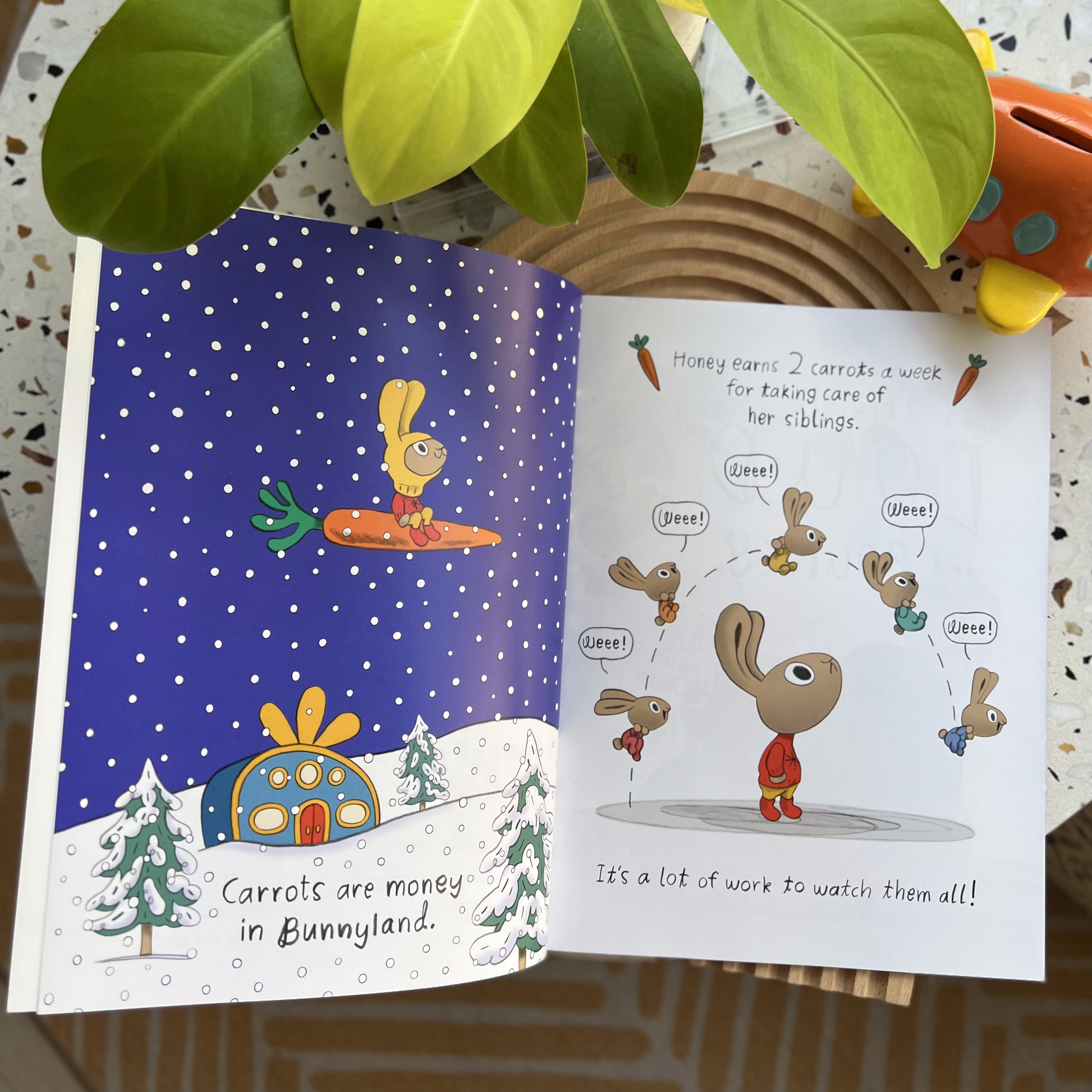 Honey earns two carrots a week for taking care of her siblings. Her FIVE siblings who are so loud and bouncy, she wishes she had a place of her own to escape to for some peace and quiet. So what's a bunny to do? Get creative and figure out a savings plan, even if it means forgoing a treat or two. But saving is worth it because with a little patience and perseverance, Honey will be able to make her dream of having her owns space come true!