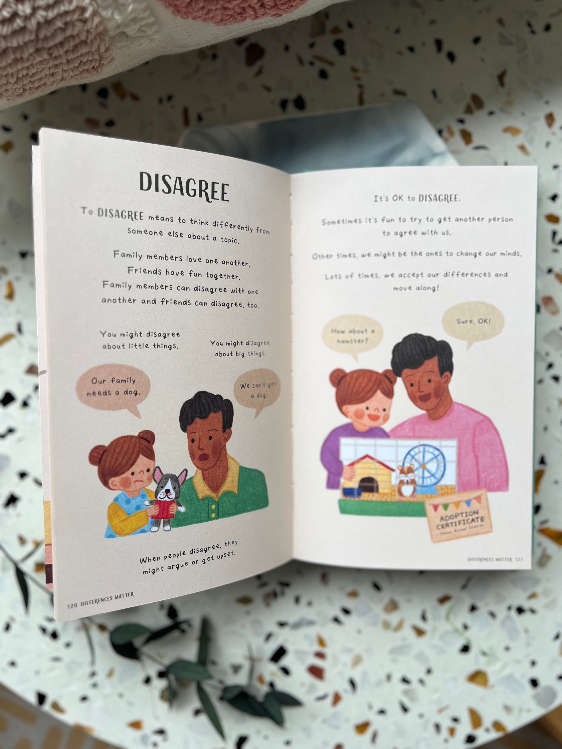 Each page offers a word and age-appropriate definition, along with a related activity, resource, or mindful prompt, beautifully illustrated by Instagram star Annelies Draws. The book is split into four chapters that each includes relevant words: Feelings Matter (Afraid, Frustrated, Proud); You Matter (Authentic, Consent, Resilience); Differences Matter (Disability, Equity, Race); and Changemakers Matter (Conservation, Feminism, Teamwork).