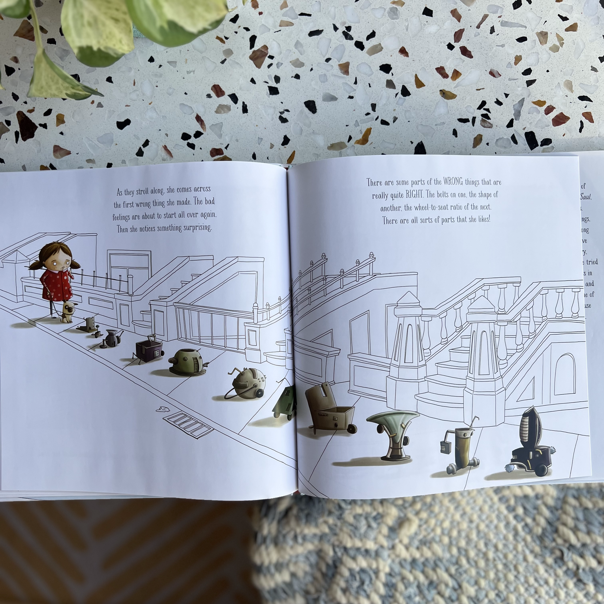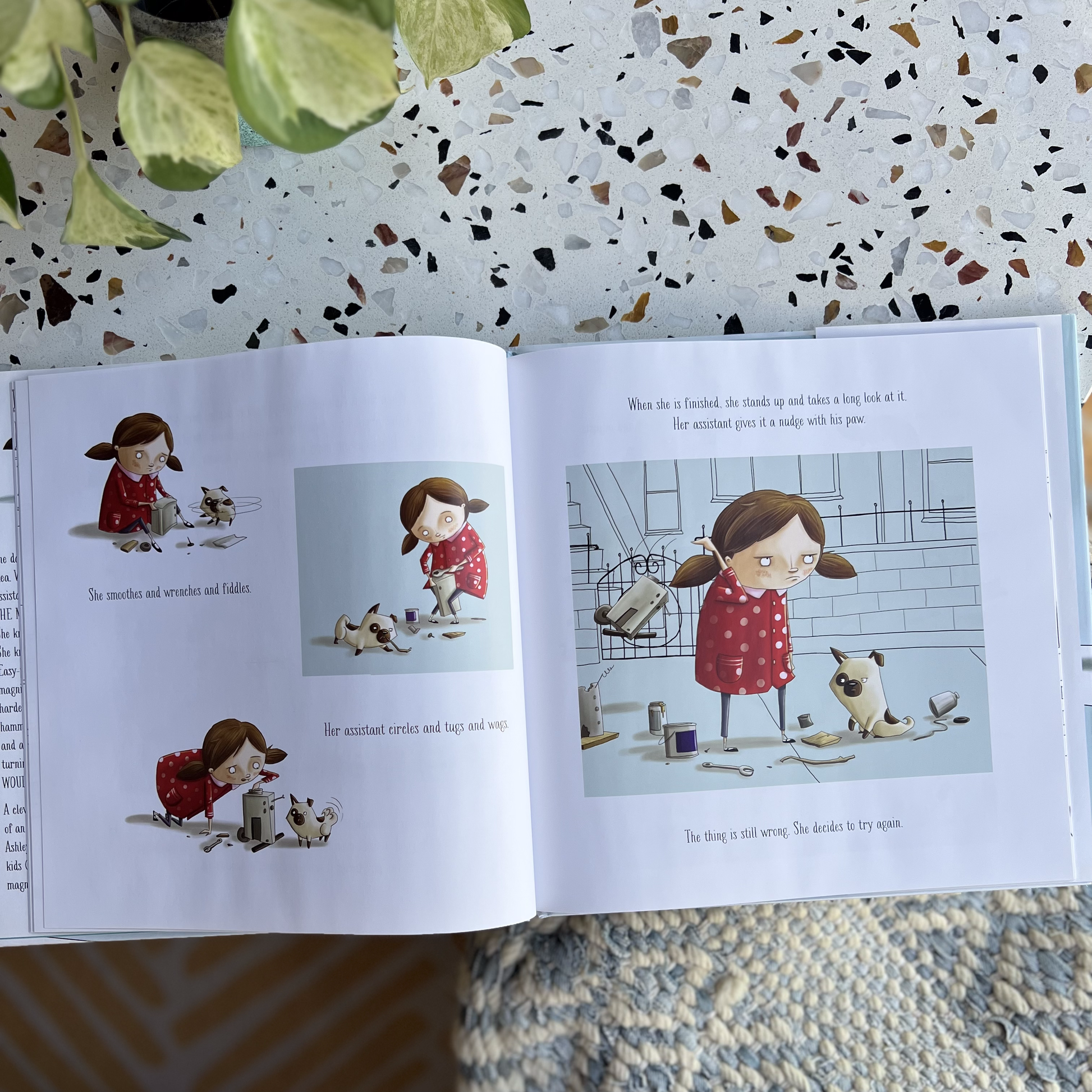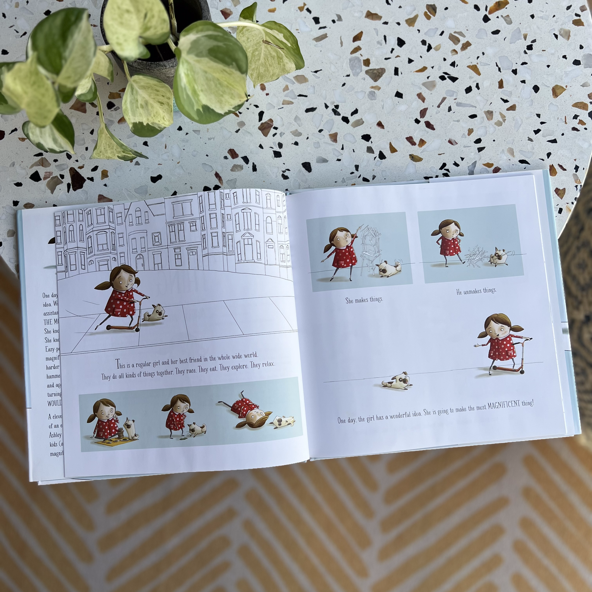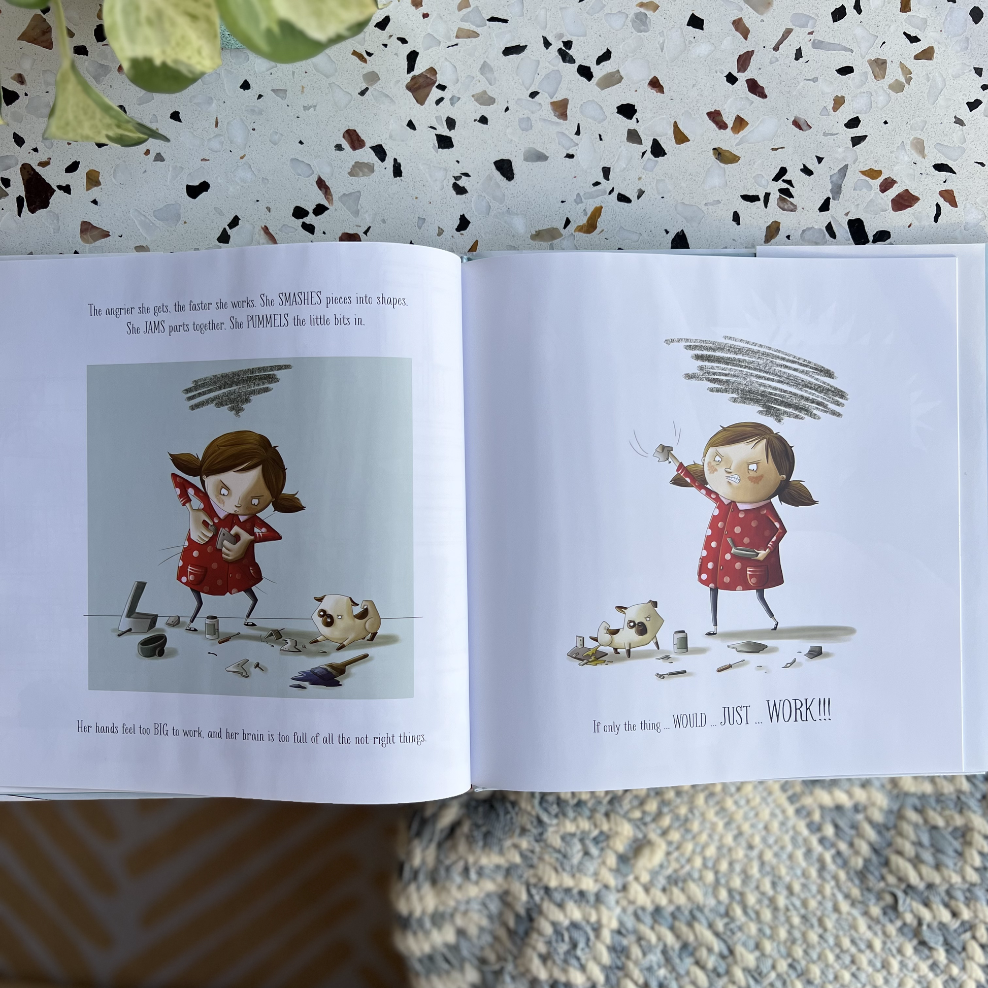 A little girl has a wonderful idea. “She is going to make the most MAGNIFICENT thing! She knows just how it will look. She knows just how it will work. All she has to do is make it, and she makes things all the time. Easy-peasy!” But making her magnificent thing is anything but easy, and the girl tries and fails, repeatedly. Eventually, the girl gets really, really mad. She is so mad, in fact, that she quits. But after her dog convinces her to take a walk, she comes back to her project with renewed enthusiasm and manages to get it just right.