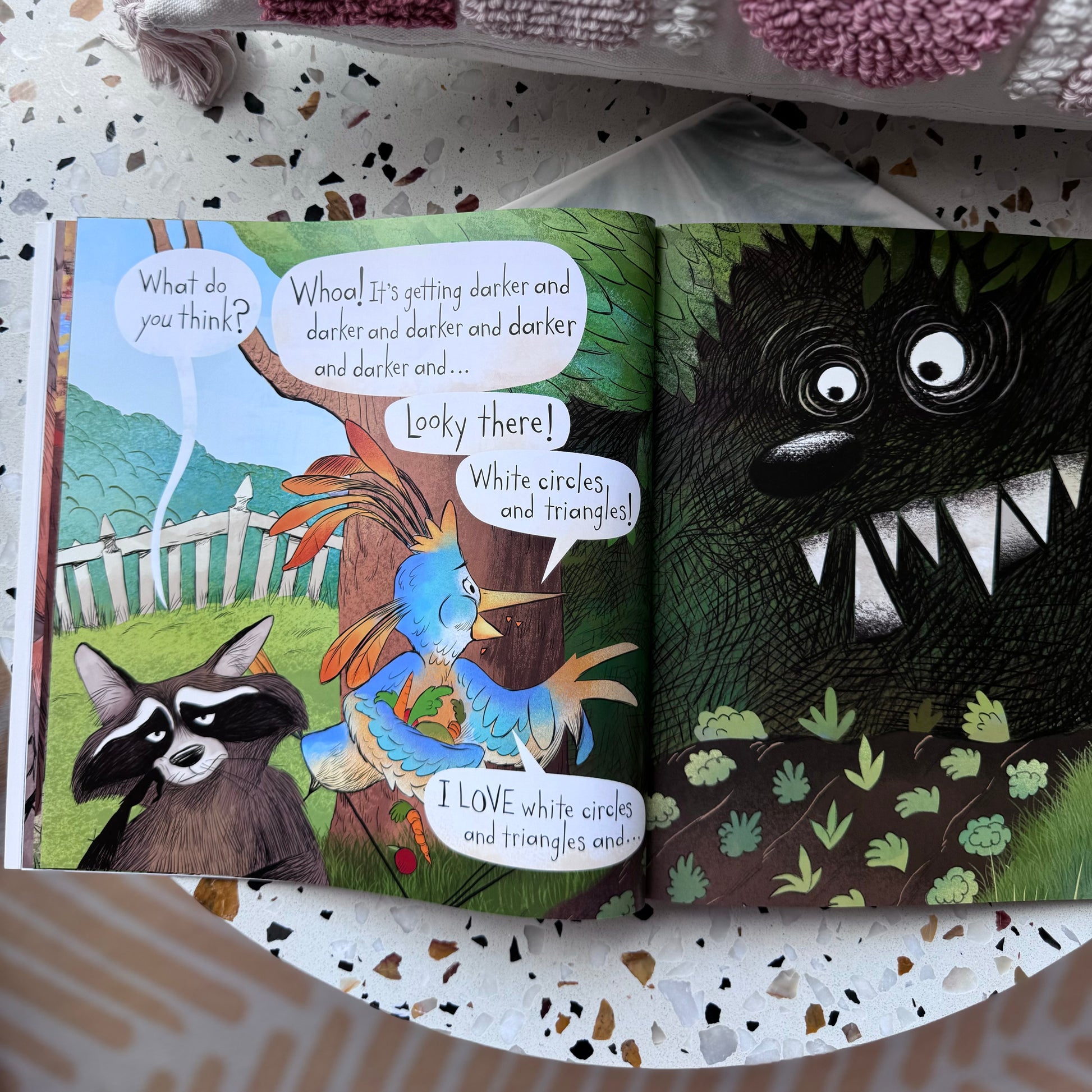 Wordy Birdy LOVES to talk. “Hello, sunrise. Hello, pink sky. Hello, orange sky!” But does she love to listen? NOPE. One day, while she’s walking through the forest, her gift of the gab gets her into hot water: “That’s a pretty tree and that’s a pretty tree and that’s a pretty danger sign and that’s a pretty tree. . . .” Will this inattentive bird walk right into danger? Will her faraway thoughts lead her along a path of doom? It’s up to her long-suffering, heard-it-all-before pals Squirrel, Raccoon, and Rabbit to save their distracted friend.